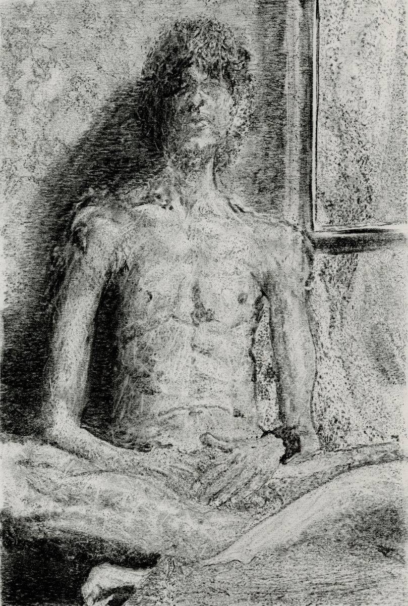 This delicate depiction is in charcoal and Laurence has built up layers of pointed marks which are loose and sharp which all together culminate in this wonderous ethereal figurative work. An ultimately slow if fast paced creative process.